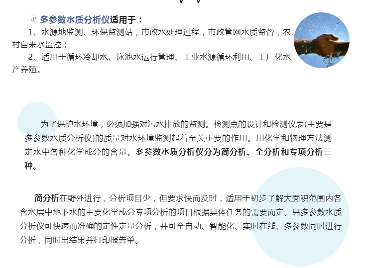 為了保護水環境,必須加強對污水排放的監測。檢測點的設計和檢測儀表(主要是多參數水質分析儀)的質量對水環境監測起著至關重要的作用。用化學和物理方法測定水中各種化學成分的含量。多參數水質分析儀分為簡分析、全分析和專項分析三種。