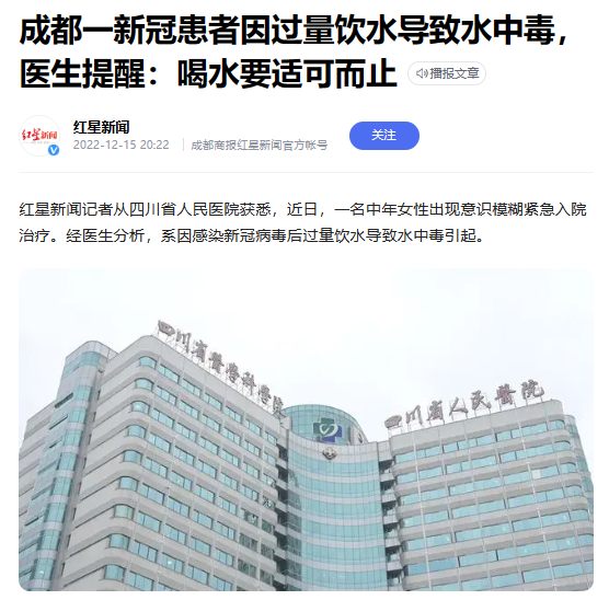 陽”了就要多喝水,這是大家熟知的防治新冠小妙招。然而,喝水也是有講究的,否則可能適得其反,引發其他問題。近日,一名新冠陽性的女患者就因為喝水過量,導致“水中毒”,被送到四川省人民醫院進行搶救。什么是“水中毒”水中毒(water intoxication),又稱稀釋性低鈉血癥…